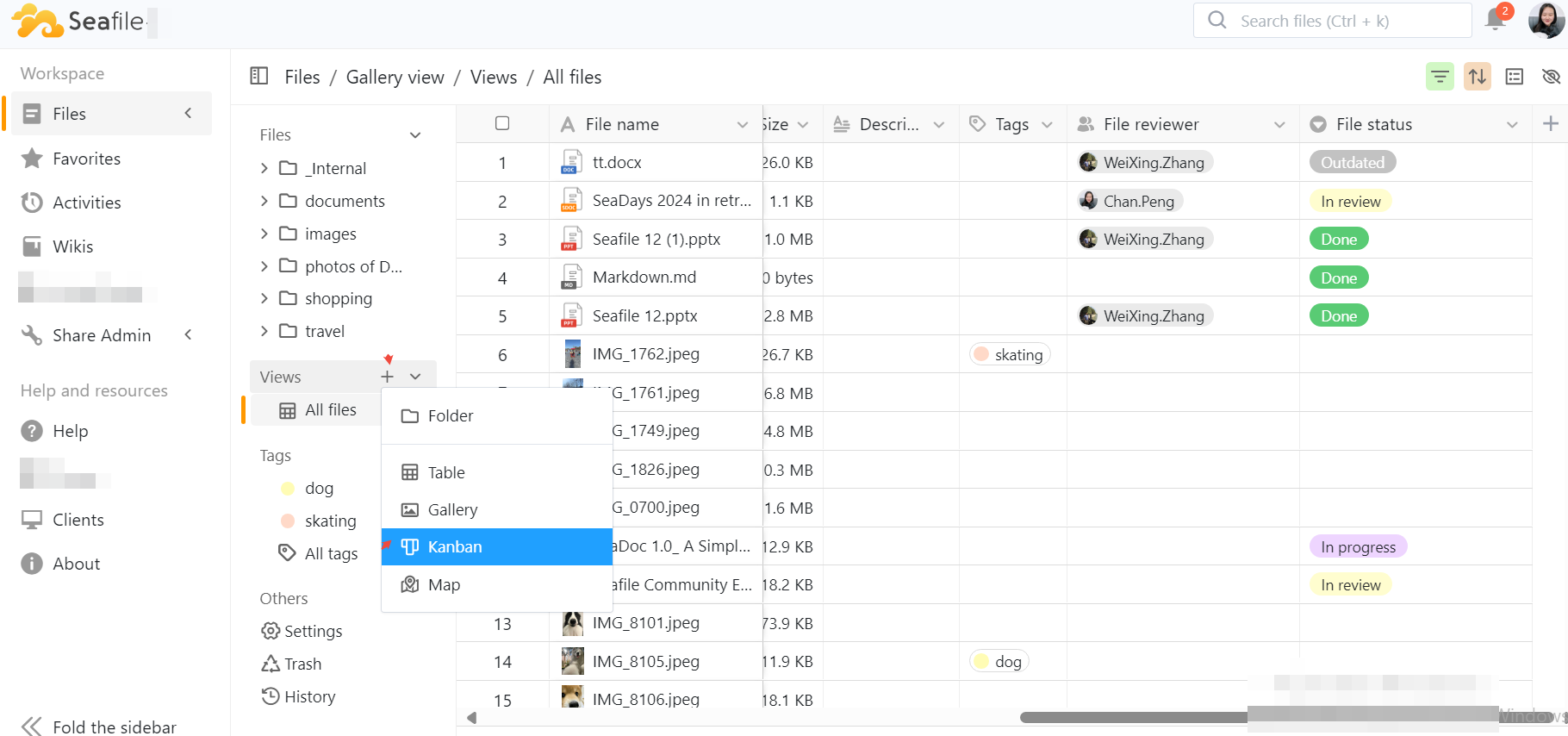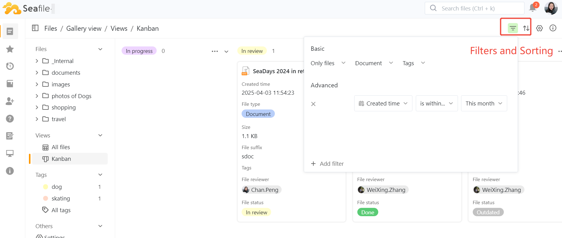 - Group by:Choose how to categorize files in the Kanban. The default setting is by File status. Options include: In Progress, In review, Done, Outdated.