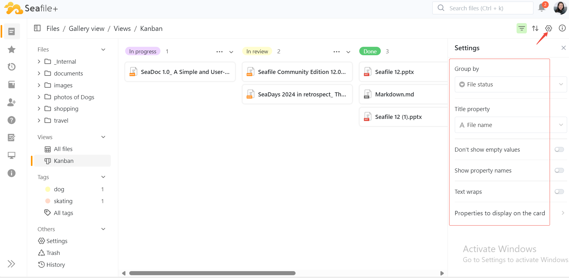 The Kanban view settings allow users to customize how their files are displayed and organized.