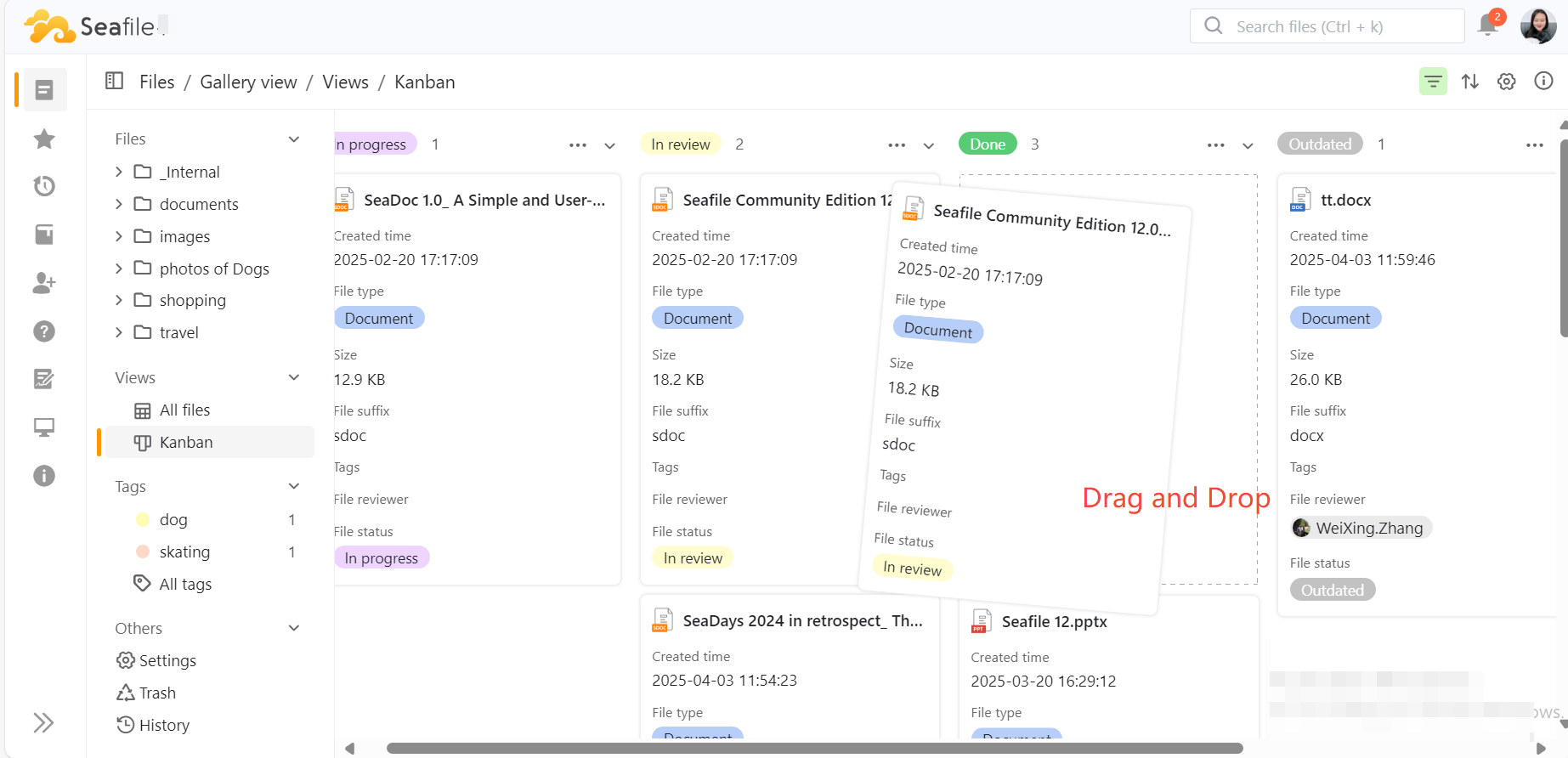 Drag and Drop: Move files between different statuses by dragging and dropping cards from one group to another, facilitating an agile workflow.