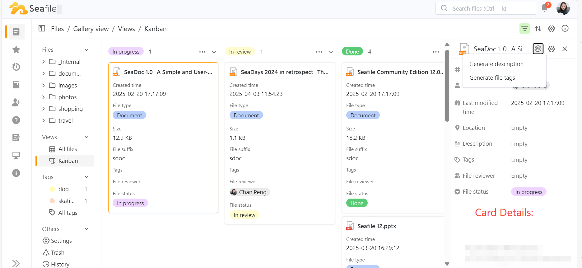 Card Details: Click on a card to view more details about the file or to edit its content. Above the detailed information section, users can choose to generate a description or tags for the file through AI.
