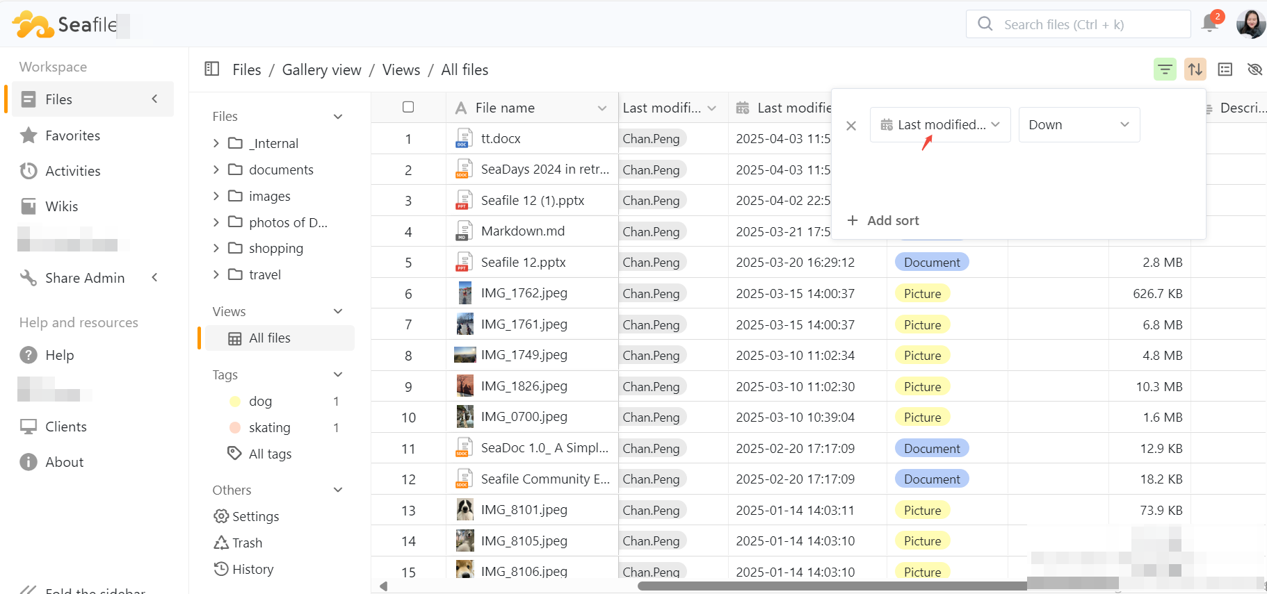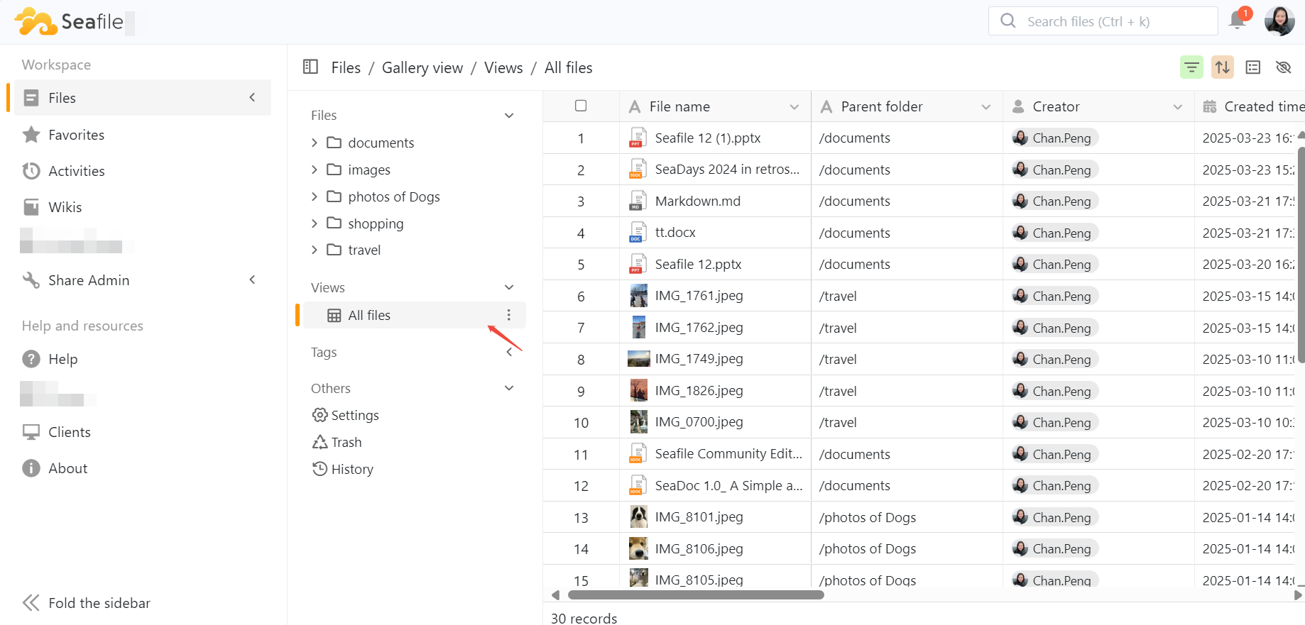 It displays key metadata for each file, such as file name, creator, created time, Last modifier, file type (e.g., image, document), and file size.