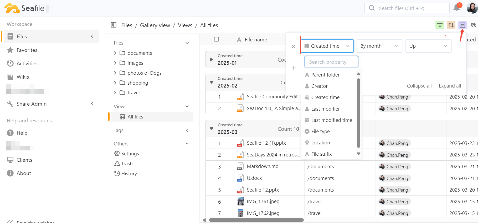 Options include, but are not limited to, file name, parent folder, creator, last modifier, created time,last modified time, and size.