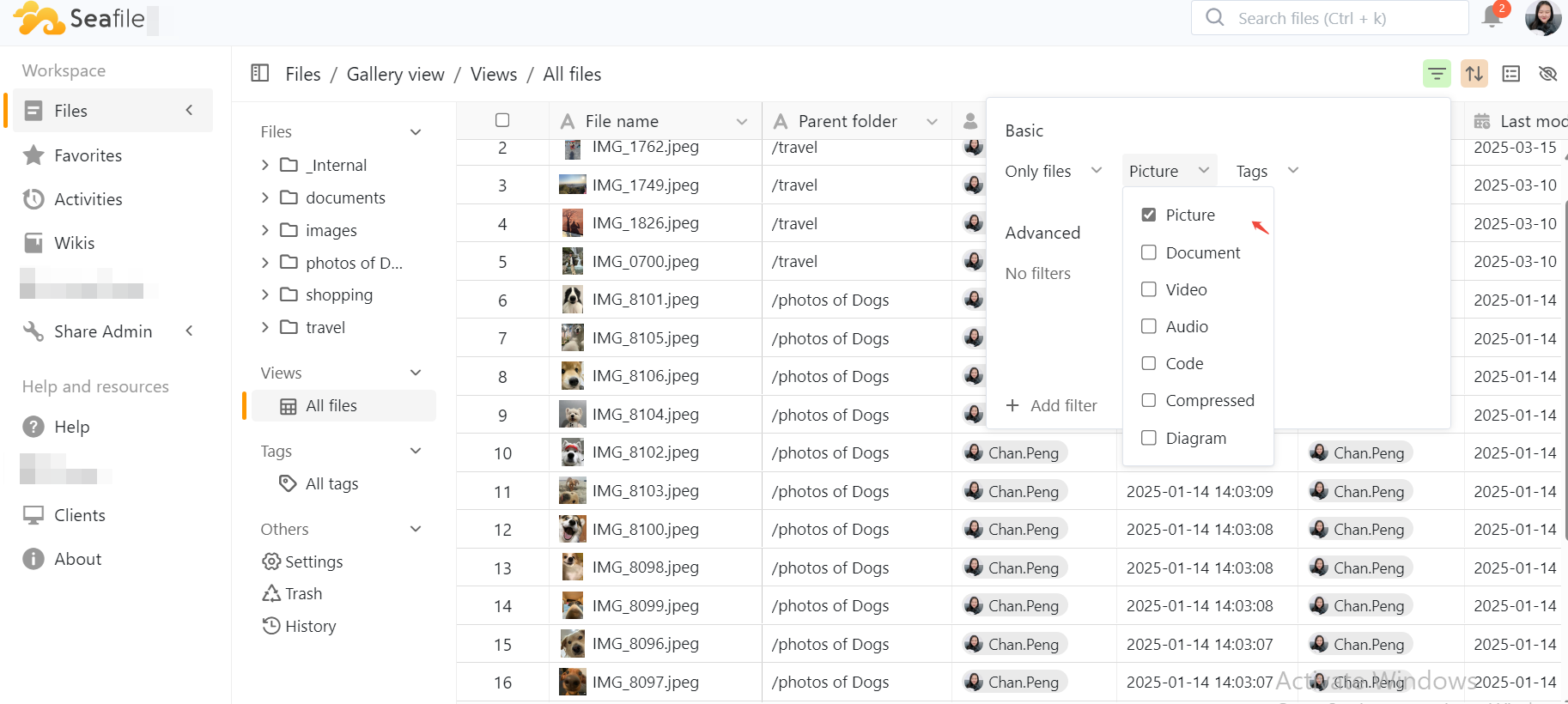 - Select specific file types, including picture, document, videos, audio, code, compressed, and diagram.