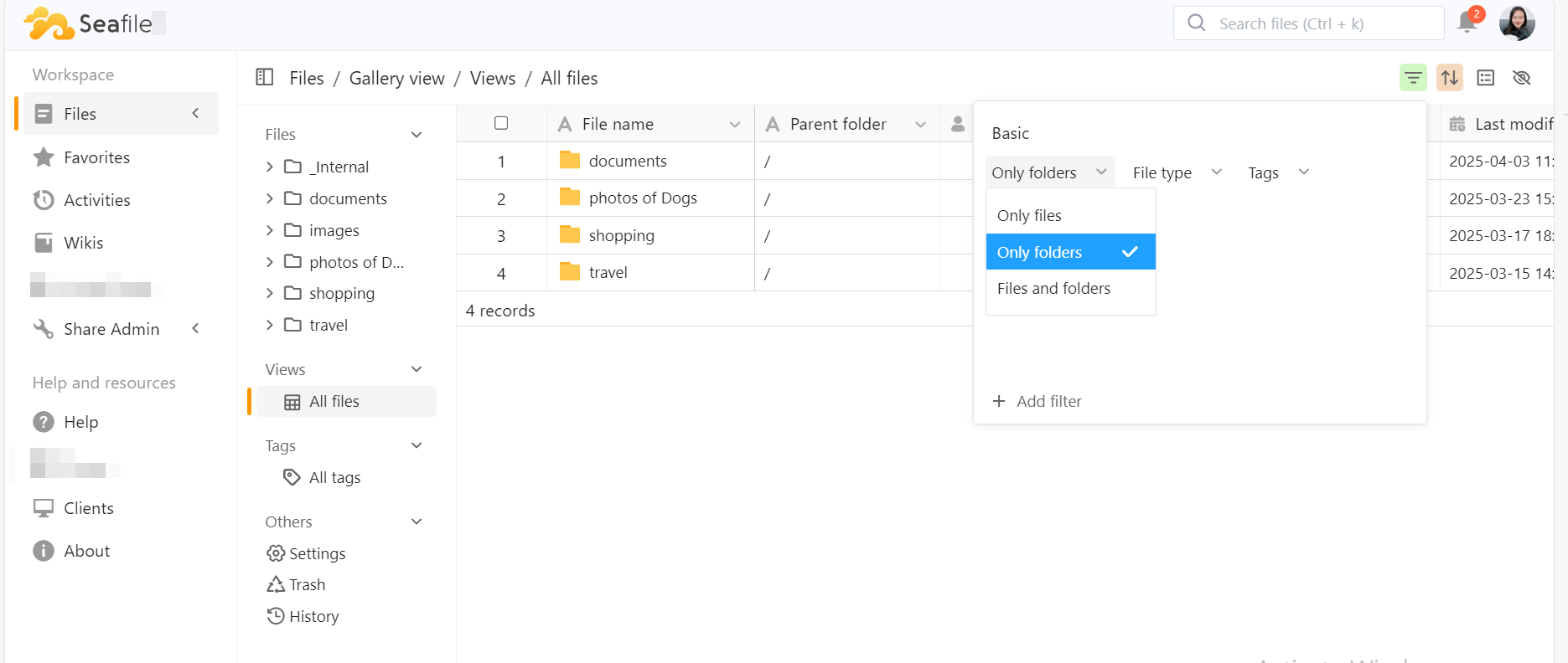 - Choose to display only files or folders.