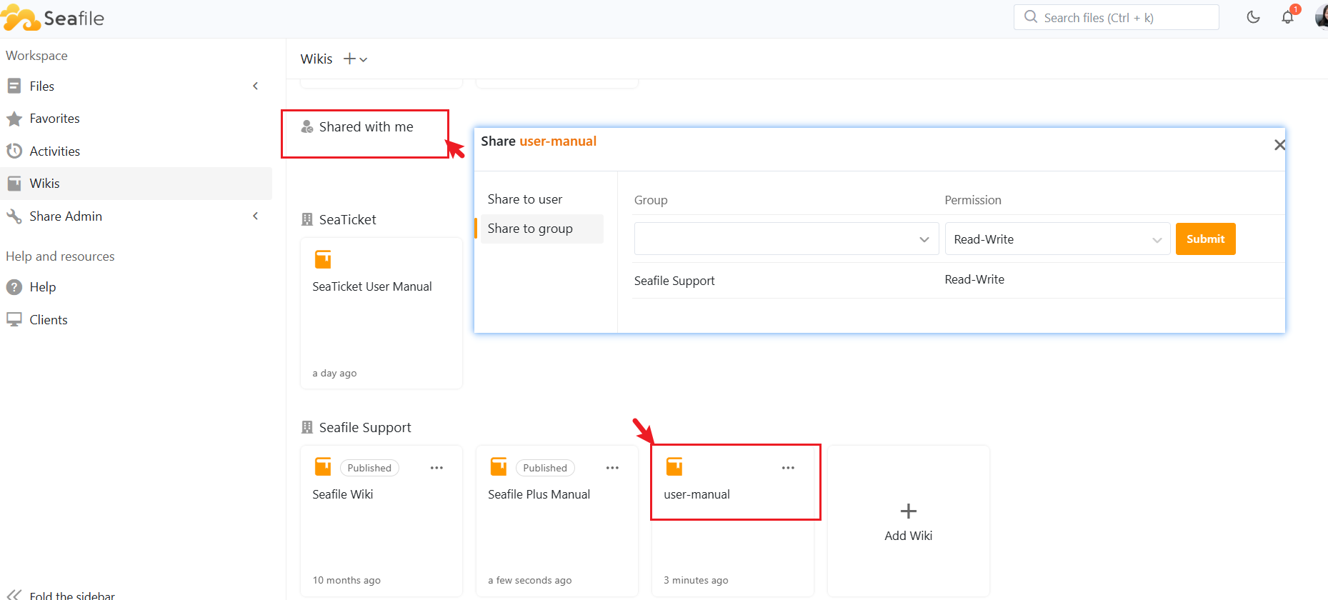 Users will find the shared wiki in the "Shared with Me" section or in their respective groups.