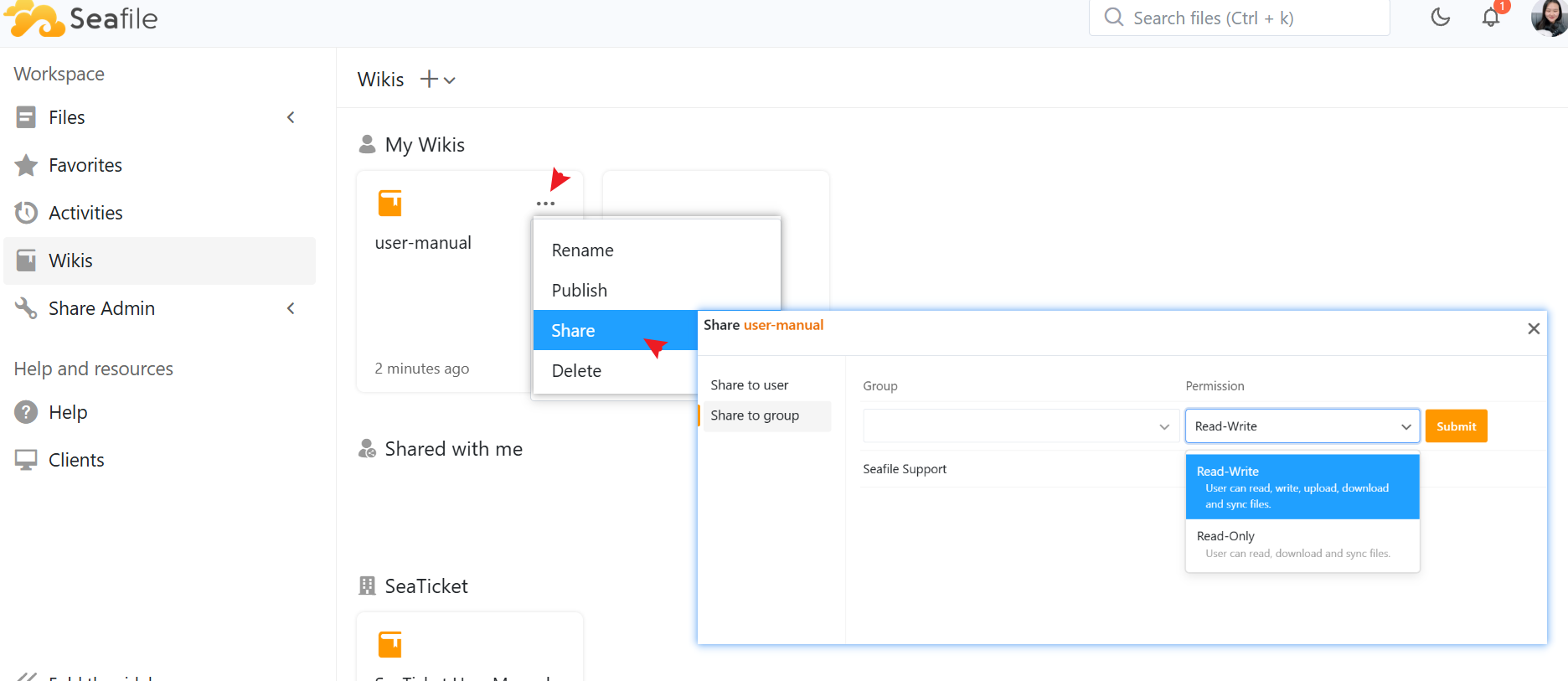 - Read-Write Permission Allows users to view, edit, upload, download, and sync files in the wiki.